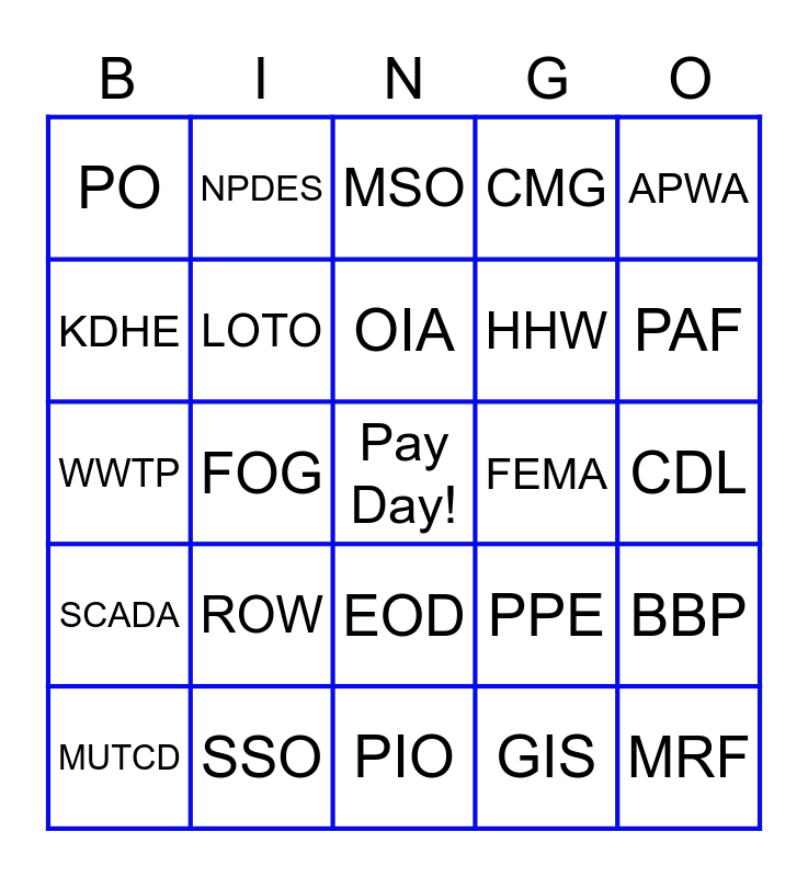 This bingo card has a free space and 24 words: ROW, SSO, OIA, MUTCD, APWA, PO, KDHE, NPDES, FEMA, EOD, HHW, WWTP, PPE, BBP, LOTO, GIS, CDL, MSO, PAF, FOG, MRF, SCADA, CMG and PIO.