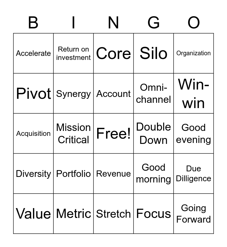 This bingo card has a free space and 32 words: Focus, Renewal, Mission Critical, Proactive, Diversity, Synergy, Organization, Due Dilligence, Return on investment, Right-size, Account, Core, Adoption, Lean In, Double Down, Growth, Value, Acquisition, Revenue, Portfolio, Good morning, Good afternoon, Good evening, Metric, Going Forward, Silo, Omni-channel, Pivot, Accelerate, Stretch, Pipeline and Win-win.
