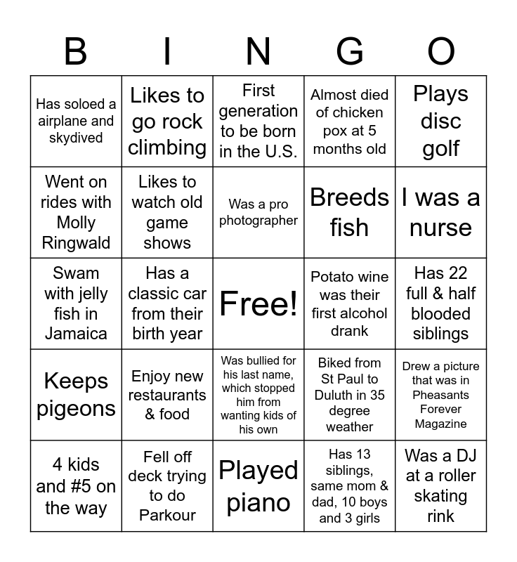 This bingo card has a free space and 24 words: Enjoy new restaurants & food, Fell off deck trying to do Parkour, Was a pro photographer, 4 kids and #5 on the way, Plays disc golf, Has soloed a airplane and skydived, Went on rides with Molly Ringwald, Likes to go rock climbing, Potato wine was their first alcohol drank, Was bullied for his last name, which stopped him from wanting kids of his own, Breeds fish, Swam with jelly fish in Jamaica, Biked from St Paul to Duluth in 35 degree weather, Drew a picture that was in Pheasants Forever Magazine, Likes to watch old game shows, Has 13 siblings, same mom & dad, 10 boys and 3 girls, Has 22 full & half blooded siblings, First generation to be born in the U.S., I was a nurse, Has a classic car from their birth year, Was a DJ at a roller skating rink, Keeps pigeons, Almost died of chicken pox at 5 months old and Played piano.