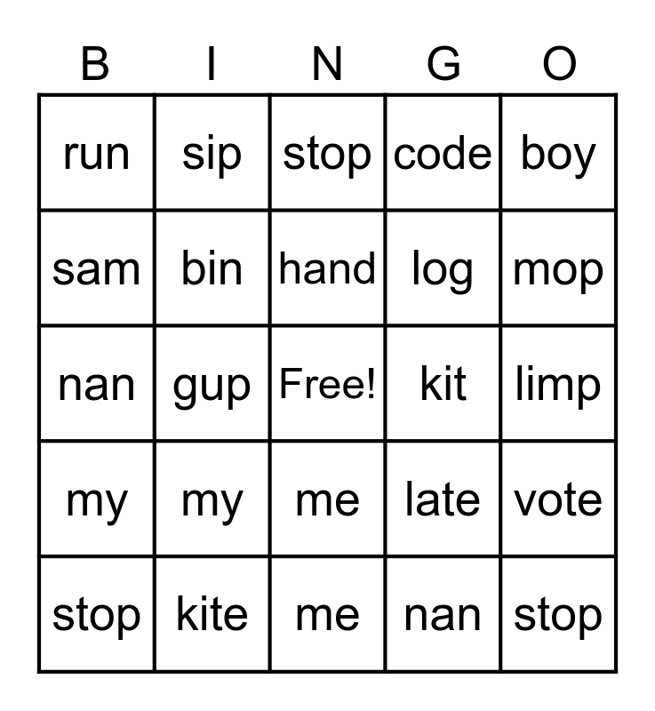 ⚠ This card has duplicate items: mop (2), stop (3), like (2), me (2), my (2), tin (2), sip (2), pine (2), sam (2), kite (2), bin (2), code (2), vote (2), late (2), limp (2), hand (2), kit (2), same (2), boy (2), gup (2), nan (2), run (2), log (2)