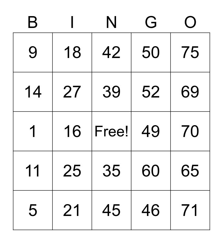 This bingo card has a free space and 24 words: 5, 25, 39, 46, 75, 9, 18, 42, 49, 70, 1, 27, 60, 65, 14, 21, 45, 50, 69, 11, 16, 35, 52 and 71.