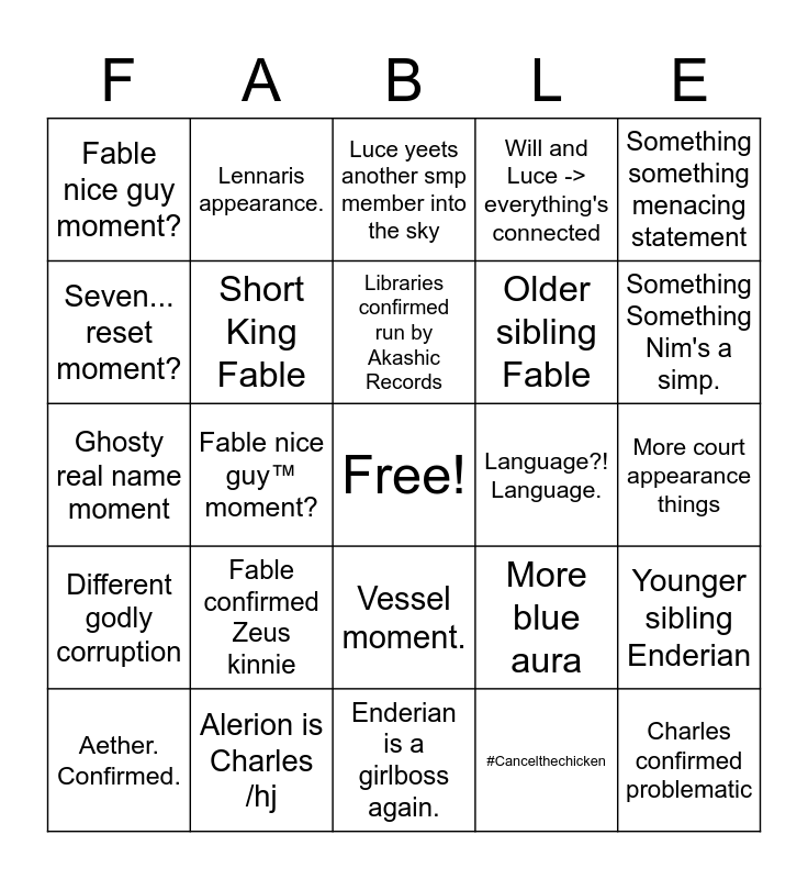 This bingo card has a free space and 24 words: Fable confirmed Zeus kinnie, Alerion is Charles /hj, Libraries confirmed run by Akashic Records, Aether. Confirmed., Something something menacing statement, Fable nice guy moment?, Seven... reset moment?, Lennaris appearance., Language?! Language., Vessel moment., Older sibling Fable, Ghosty real name moment, More blue aura, Younger sibling Enderian, Short King Fable, #Cancelthechicken, More court appearance things, Luce yeets another smp member into the sky, Something Something Nim's a simp., Fable nice guy™ moment?, Charles confirmed problematic, Different godly corruption, Will and Luce -> everything's connected and Enderian is a girlboss again..
