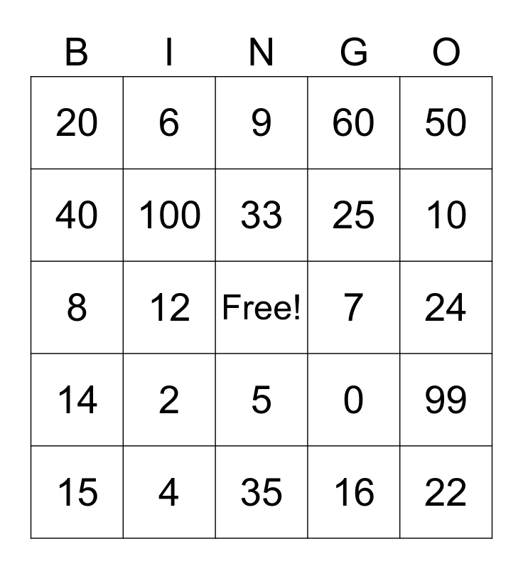 This bingo card has a free space and 26 words: 5, 16, 33, 4, 50, 20, 40, 6, 24, 0, 25, 8, 99, 15, 12, 1, 60, 14, 9, 22, 10, 35, 7, 2, 100 and 70.