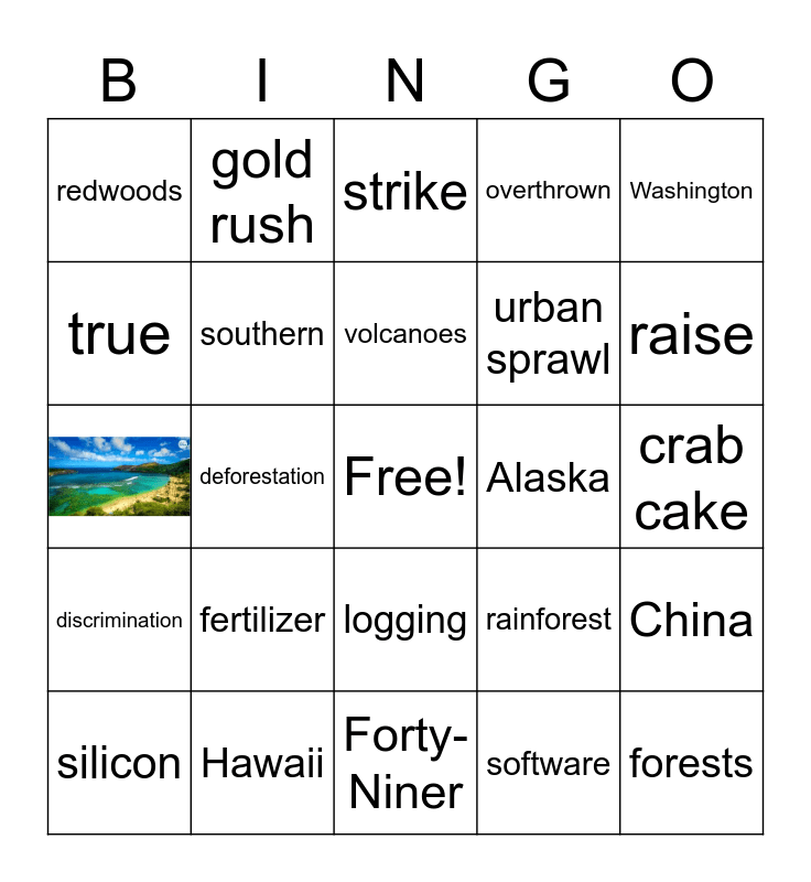 This bingo card has 1 images, a free space and 23 words: fertilizer, Hawaii, volcanoes, silicon, Washington, redwoods, true, gold rush, Alaska, logging, urban sprawl, rainforest, China, southern, software, crab cake, strike, raise, deforestation, forests, discrimination, overthrown and Forty-Niner.
