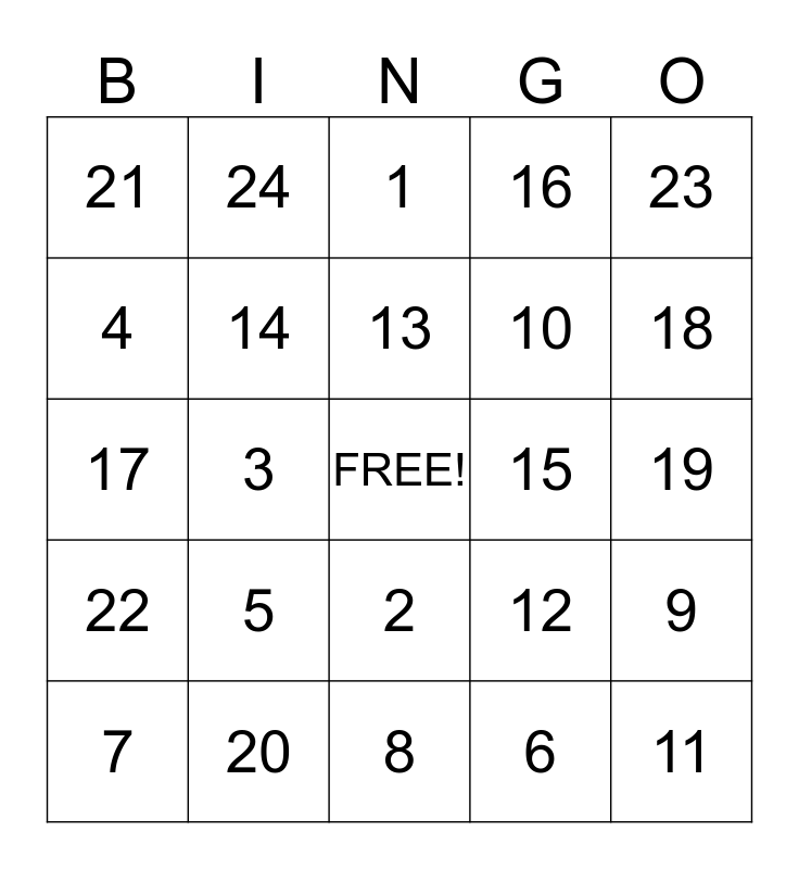 This bingo card has a free space and 24 words: 5, 20, 13, 7, 23, 21, 4, 24, 15, 2, 10, 17, 12, 9, 14, 6, 19, 1, 18, 3, 11, 22, 16 and 8.