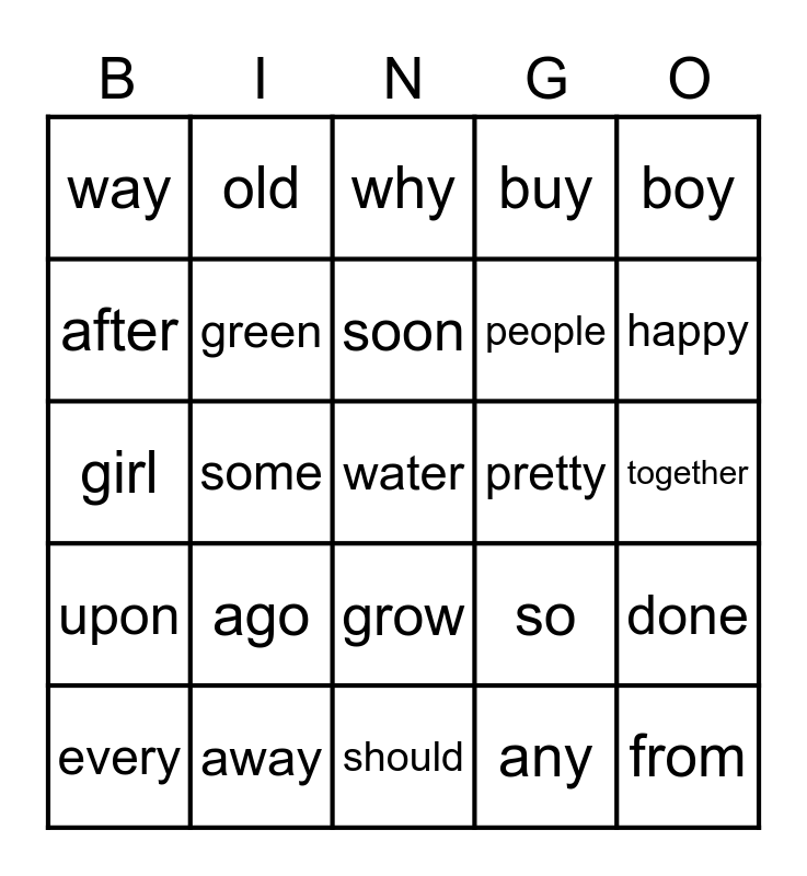 This bingo card has 30 words: away, now, some, today, way, why, green, grow, pretty, should, together, water, any, from, happy, once, so, upon, ago, boy, girl, how, old, people, after, buy, done, every, soon and work.