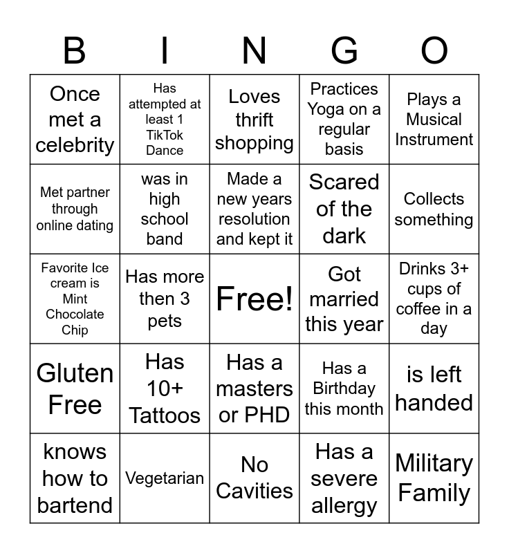 This bingo card has a free space and 24 words: Has 10+ Tattoos, Vegetarian, Made a new years resolution and kept it, knows how to bartend, Plays a Musical Instrument, Once met a celebrity, Met partner through online dating, Has attempted at least 1 TikTok Dance, Got married this year, Has a masters or PHD, Scared of the dark, Favorite Ice cream is Mint Chocolate Chip, Has a Birthday this month, is left handed, was in high school band, Has a severe allergy, Drinks 3+ cups of coffee in a day, Loves thrift shopping, Collects something, Has more then 3 pets, Military Family, Gluten Free, Practices Yoga on a regular basis and No Cavities.