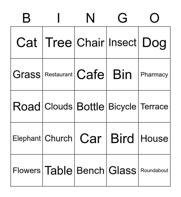 This bingo card has 25 words: Church, Bench, Cafe, Flowers, Dog, Cat, Grass, Tree, Bicycle, Car, Bin, Road, Bird, House, Restaurant, Roundabout, Terrace, Chair, Pharmacy, Clouds, Bottle, Table, Elephant, Insect and Glass.