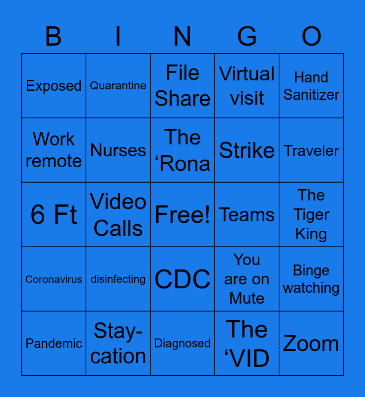 This bingo card has a free space and 55 words: Sick, Pandemic, Virus, Exposed, Diagnosed, Vaccinated, Nurses, Providers, Strike, Telehealth, Virtual visit, Burnout, WFH, Safe to travel, Bread Baking, Toilet Paper, Hand Sanitizer, Video Calls, Webex, Zoom, Teams, Chat, You are on Mute, File Share, Work from Home, The ‘Rona, The ‘VID, COVID, The Tiger King, Binge watching, Stretch Pants, Yoga Pants/Sweats, N95, Mask, Work remote, 6 Ft, Social Distancing, Coronavirus, Cleaning wipes, Schools Cancelled, Quarantine, Vaccine, Wash your hands, Buy in Bulk, disinfecting, Stay-cation, The Great Resignation, The Great Quit, Contract Labor, Traveler, Cares Act, Provider Relief Funds, FEMA, CDC and Eat Outside/Outside Dining.