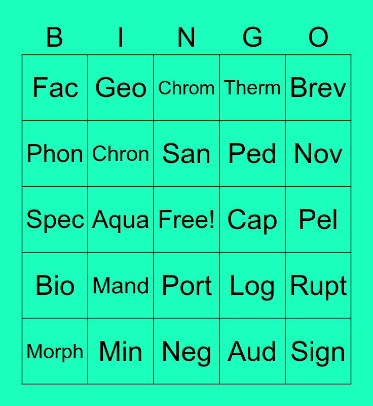 This bingo card has a free space and 24 words: Mand, Min, San, Morph, Brev, Fac, Phon, Geo, Cap, Port, Ped, Spec, Log, Rupt, Chron, Aud, Pel, Chrom, Nov, Aqua, Sign, Bio, Therm and Neg.