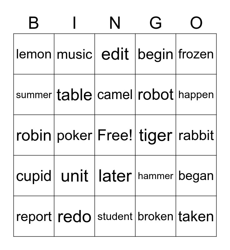 This bingo card has a free space and 24 words: unit, redo, camel, report, frozen, lemon, summer, music, tiger, later, robot, robin, hammer, began, table, broken, rabbit, edit, happen, poker, taken, cupid, begin and student.