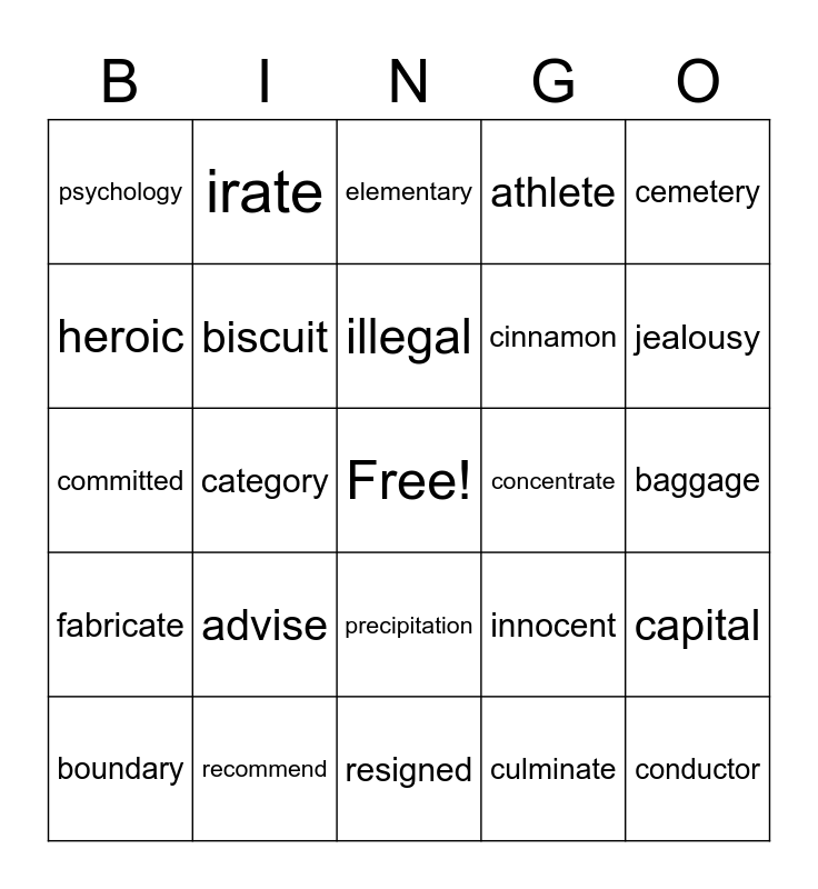 This bingo card has a free space and 28 words: capital, inherit, cinnamon, culminate, heroic, elementary, irate, fabricate, concentrate, boundary, committed, athlete, recommend, resigned, jealousy, economics, advise, biscuit, illegal, precipitation, psychology, emphasize, conductor, category, baggage, innocent, cemetery and idol.