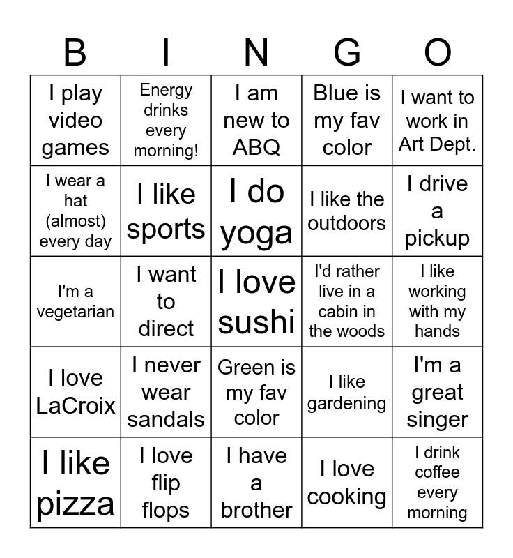 This bingo card has 55 words: I love horror movies, I like pizza, I don't watch TV, I play video games, I have a brother, I have a sister, I like sports, I love reading, I like the outdoors, Red is my fav color, Blue is my fav color, I hate Doritos, I love comedies, I want to work in Camera, I like camping, I like fishing, I want to work in Art Dept., I want to direct, I like working out, I love sushi, I'd rather live in a cabin in the woods, I hate drinking water, I like gardening, I am new to ABQ, I'd rather live on the Beach, I do yoga, I love cooking, I love dancing, I like working with my hands, I'm a great singer, I have a dog, I have a cat, I have a fish, I love to paint my nails, I wear a hat (almost) every day, I'm a vegetarian, I hate vegetables, I love LaCroix, I drink coffee every morning, I drink tea every morning, Energy drinks every morning!, I drink soda every morning, I drink hot coffee in the summer, I drink iced coffee in the winter, I never wear sandals, I love flip flops, I'm a morning person, I'm a night owl, I bike to work, I drive a pickup, I hate horror movies, I love reality TV, I was born in NM, Green is my fav color and I watch baseball.