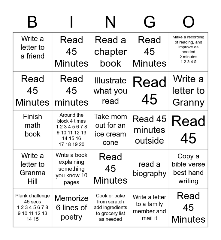 This bingo card has a free space and 29 words: Read 45 Minutes, Memorize 6 lines of poetry, Read a chapter book, Read a book of the Bible, Make a recording of reading, and improve as needed 2 minutes 1 2 3 4 5, Write a letter to a friend, Read 45 minutes, Illustrate what you read, Read 45 minutes outside, Copy a bible verse best hand writing, Plank challenge 45 secs 1 2 3 4 5 6 7 8 9 10 11 12 13 14 15, Around the block 4 times 1 2 3 4 5 6 7 8 9 10 11 12 13 14 15 16 17 18 19 20, Write a letter to a family member and mail it, Read 45 Minutes, Finish math book, Read 45, Cook or bake from scratch add ingredients to grocery list as needed, read a biography, Write a letter to Granny, Write a letter to Granma Hill, Write a book explaining something you know 10 pages, Read 45, Read 45, Read 45, Read 45 Minutes, Read 45 Minutes, Read 45 Minutes, Read 45 Minutes and Read 45 Minutes.