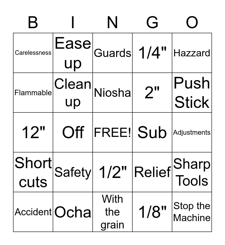 This bingo card has a free space and 24 words: Safety, Ocha, Niosha, Accident, Hazzard, Carelessness, Flammable, Ease up, Sub, 1/2", 2", 12", Relief, Sharp Tools, Clean up, 1/8", Adjustments, Guards, Push Stick, Off, Stop the Machine, Short cuts, 1/4" and With the grain.