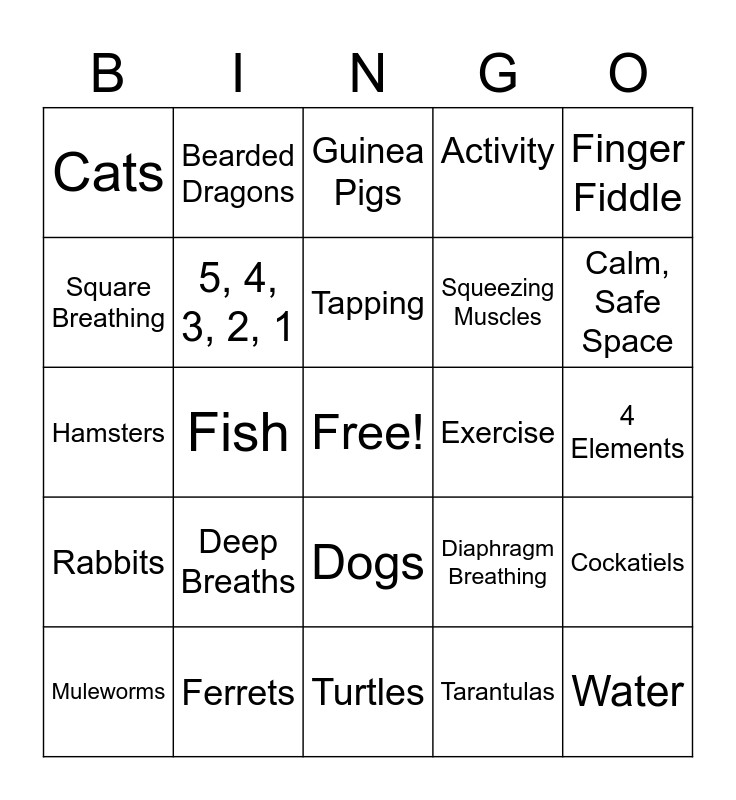 This bingo card has a free space and 24 words: Deep Breaths, Ferrets, Tapping, Muleworms, Finger Fiddle, Cats, Square Breathing, Bearded Dragons, Exercise, Dogs, Squeezing Muscles, Hamsters, Diaphragm Breathing, Cockatiels, 5, 4, 3, 2, 1, Tarantulas, 4 Elements, Guinea Pigs, Calm, Safe Space, Fish, Water, Rabbits, Activity and Turtles.