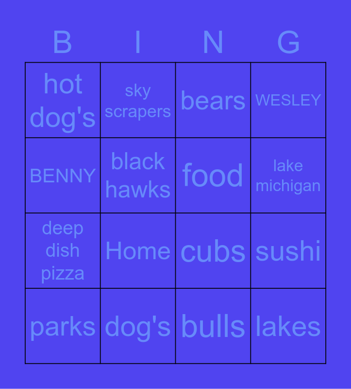 This bingo card has 16 words: dog's, sushi, bears, hot dog's, deep dish pizza, sky scrapers, cubs, bulls, BENNY, black hawks, parks, WESLEY, Home, lake michigan, food and lakes.
