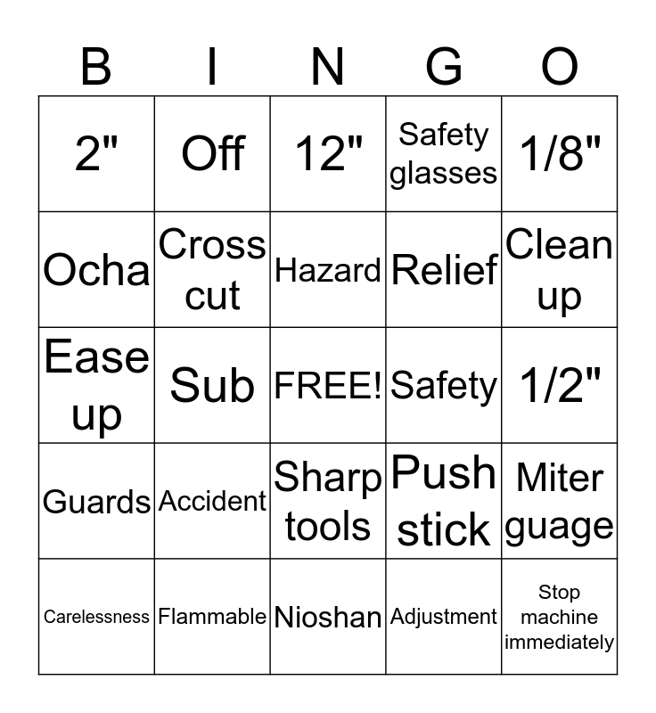 This bingo card has a free space and 24 words: Accident, Flammable, Hazard, Carelessness, 1/8", 2", Ocha, Off, Safety, Sharp tools, Relief, Ease up, Push stick, Miter guage, Cross cut, Adjustment, 1/2", 12", Clean up, Sub, Stop machine immediately, Guards, Safety glasses and Nioshan.