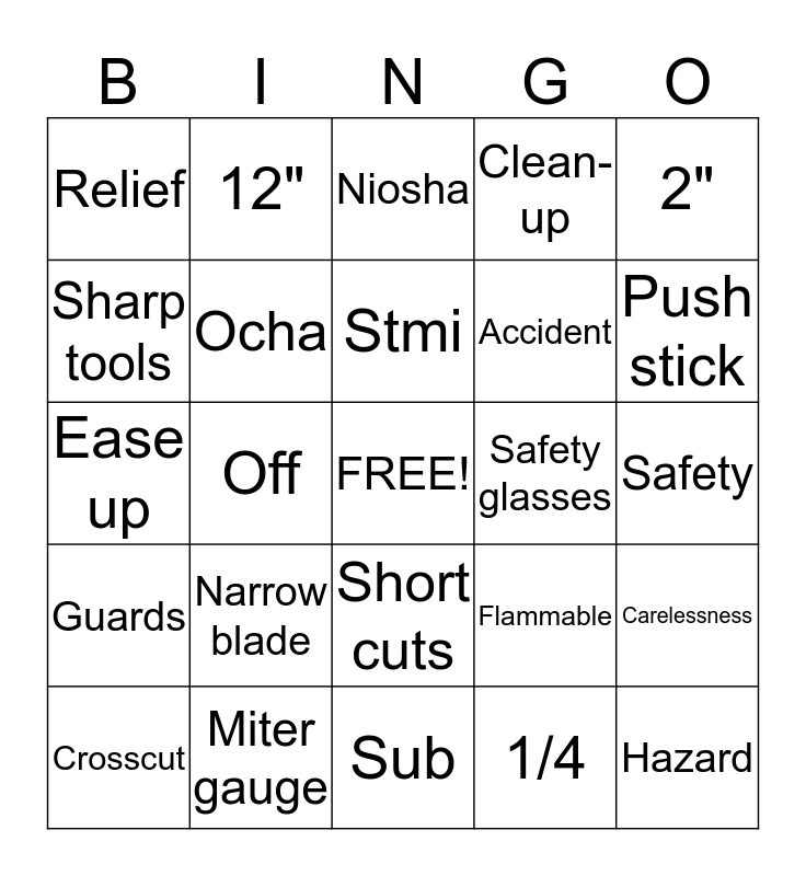 This bingo card has a free space and 24 words: Narrow blade, Miter gauge, Stmi, Crosscut, 2", Relief, Sharp tools, 12", Safety glasses, Short cuts, Accident, Ease up, Flammable, Carelessness, Ocha, 1/4, Safety, Niosha, Push stick, Off, Hazard, Guards, Clean-up and Sub.