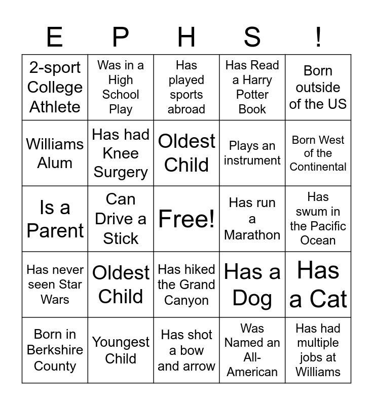 This bingo card has a free space and 24 words: Oldest Child, Youngest Child, Oldest Child, Born in Berkshire County, Born outside of the US, 2-sport College Athlete, Williams Alum, Was in a High School Play, Has run a Marathon, Has hiked the Grand Canyon, Plays an instrument, Is a Parent, Has a Dog, Has a Cat, Has had Knee Surgery, Was Named an All-American, Has swum in the Pacific Ocean, Has played sports abroad, Born West of the Continental, Can Drive a Stick, Has had multiple jobs at Williams, Has never seen Star Wars, Has Read a Harry Potter Book and Has shot a bow and arrow.