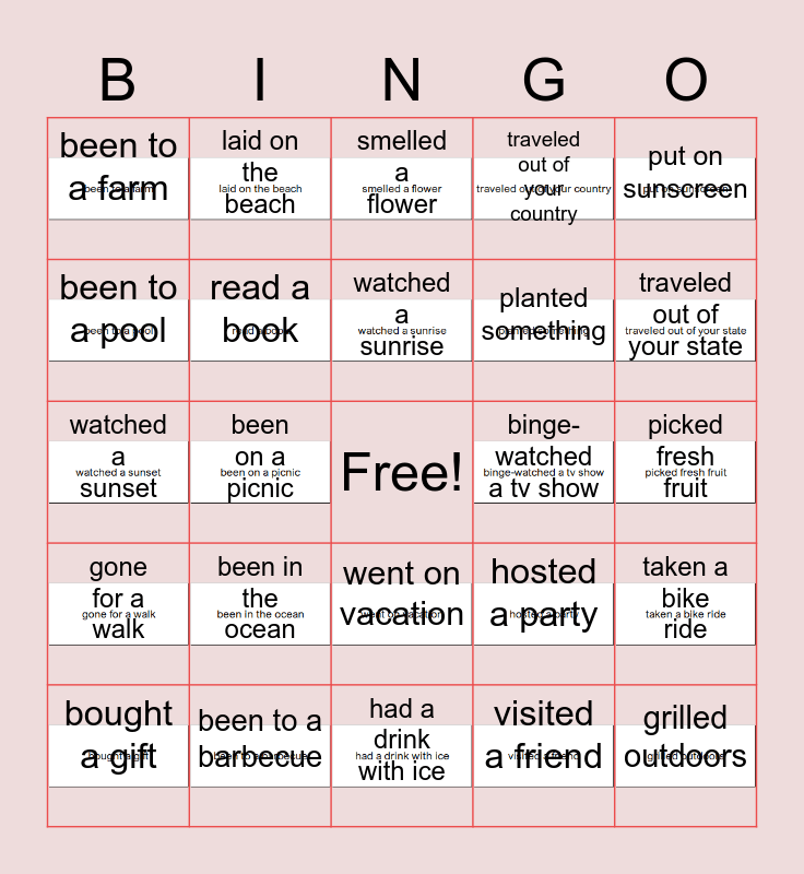 This bingo card has 24 images, a free space and 24 words: been in the ocean, been to a barbecue, watched a sunrise, bought a gift, put on sunscreen, been to a farm, been to a pool, laid on the beach, binge-watched a tv show, went on vacation, planted something, watched a sunset, hosted a party, taken a bike ride, read a book, visited a friend, picked fresh fruit, smelled a flower, traveled out of your state, been on a picnic, grilled outdoors, gone for a walk, traveled out of your country and had a drink with ice.