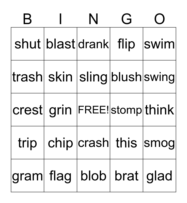 This bingo card has a free space and 34 words: plop, brat, drip, frog, trip, skin, swim, gram, blast, plump, sling, drank, grunt, trust, stomp, swing, flag, crest, chip, this, crash, swish, shut, think, blob, glad, flip, club, blush, trash, plus, grin, smog and frost.