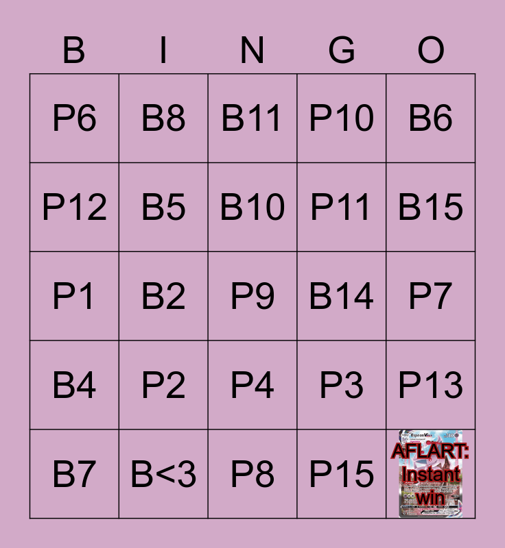 This bingo card has 1 images and 33 words: AFLART: Instant win, B1, B2, B3, B4, B5, B6, B7, B8, B9, B10, B11, B12, B13, B14, B15, B<3, P1, P2, P3, P4, P5, P6, P7, P8, P9, P10, P11, P12, P13, P14, P15 and P<3.