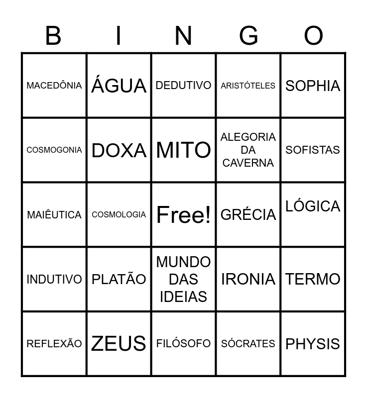 This bingo card has a free space and 24 words: PLATÃO, ZEUS, MITO, REFLEXÃO, SOPHIA, MACEDÔNIA, COSMOGONIA, ÁGUA, GRÉCIA, MUNDO DAS IDEIAS, ALEGORIA DA CAVERNA, MAIÊUTICA, IRONIA, TERMO, DOXA, SÓCRATES, LÓGICA, DEDUTIVO, SOFISTAS, COSMOLOGIA, PHYSIS, INDUTIVO, ARISTÓTELES and FILÓSOFO.