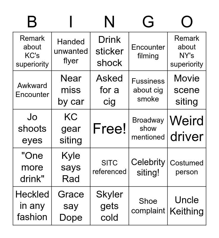 This bingo card has a free space and 24 words: Kyle says Rad, Grace say Dope, Asked for a cig, Heckled in any fashion, Remark about NY's superiority, Remark about KC's superiority, Awkward Encounter, Handed unwanted flyer, Broadway show mentioned, SITC referenced, Fussiness about cig smoke, Jo shoots eyes, Celebrity siting!, Costumed person, Near miss by car, Shoe complaint, Weird driver, Drink sticker shock, Movie scene siting, KC gear siting, Uncle Keithing, "One more drink", Encounter filming and Skyler gets cold.
