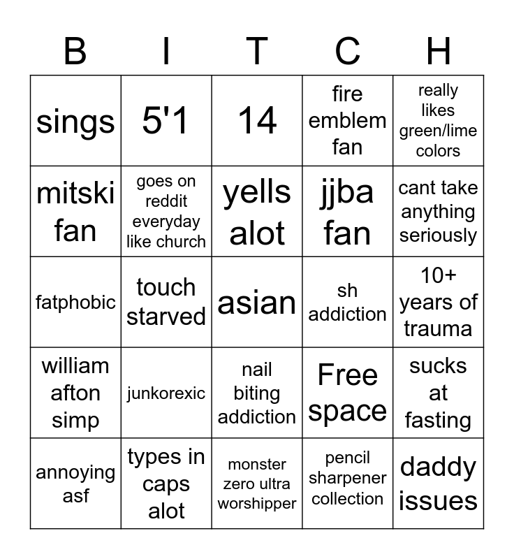This bingo card has 25 words: junkorexic, monster zero ultra worshipper, yells alot, annoying asf, really likes green/lime colors, sings, mitski fan, 5'1, sh addiction, nail biting addiction, jjba fan, fatphobic, Free space, sucks at fasting, goes on reddit everyday like church, daddy issues, 10+ years of trauma, 14, cant take anything seriously, touch starved, asian, types in caps alot, william afton simp, fire emblem fan and pencil sharpener collection.