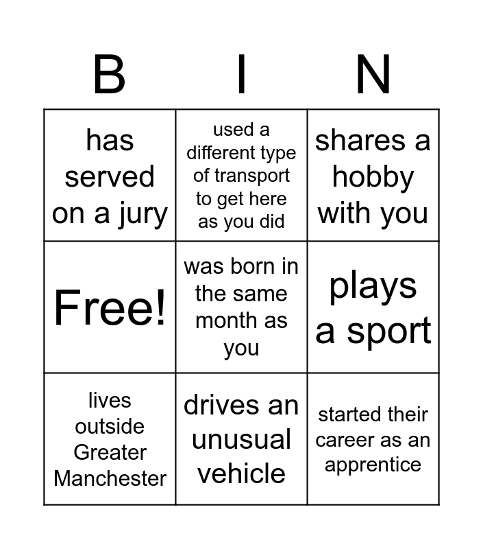 This bingo card has 14 words: has been on TV, works in a hospital, lives outside Greater Manchester, used a different type of transport to get here as you did, Free!, was born in the same month as you, started their career as an apprentice, is a vegetarian, drives an unusual vehicle, has served on a jury, plays a musical instrument, plays a sport, shares a hobby with you and is left handed.