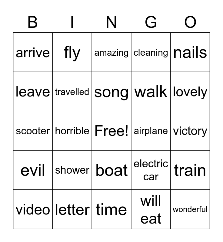 This bingo card has a free space and 24 words: shower, letter, song, video, nails, arrive, leave, fly, airplane, boat, walk, scooter, electric car, train, travelled, will eat, victory, amazing, lovely, horrible, wonderful, evil, cleaning and time.