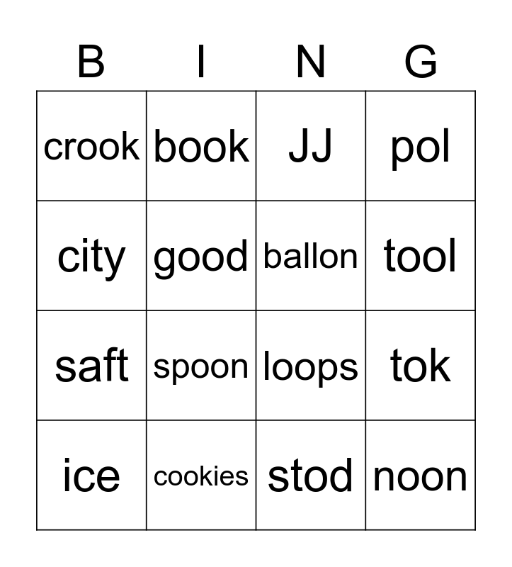 This bingo card has 16 words: cookies, tok, JJ, crook, saft, book, loops, stod, city, good, ice, pol, spoon, tool, ballon and noon.