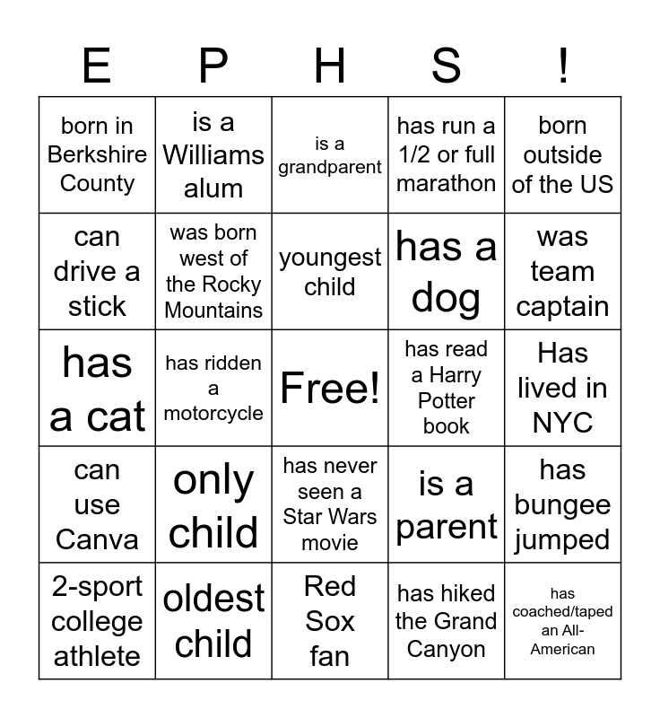 This bingo card has a free space and 24 words: only child, oldest child, youngest child, 2-sport college athlete, born outside of the US, born in Berkshire County, can drive a stick, is a Williams alum, has read a Harry Potter book, has never seen a Star Wars movie, has a dog, has a cat, is a parent, has bungee jumped, was born west of the Rocky Mountains, has hiked the Grand Canyon, Has lived in NYC, is a grandparent, was team captain, has ridden a motorcycle, has coached/taped an All-American, can use Canva, has run a 1/2 or full marathon and Red Sox fan.