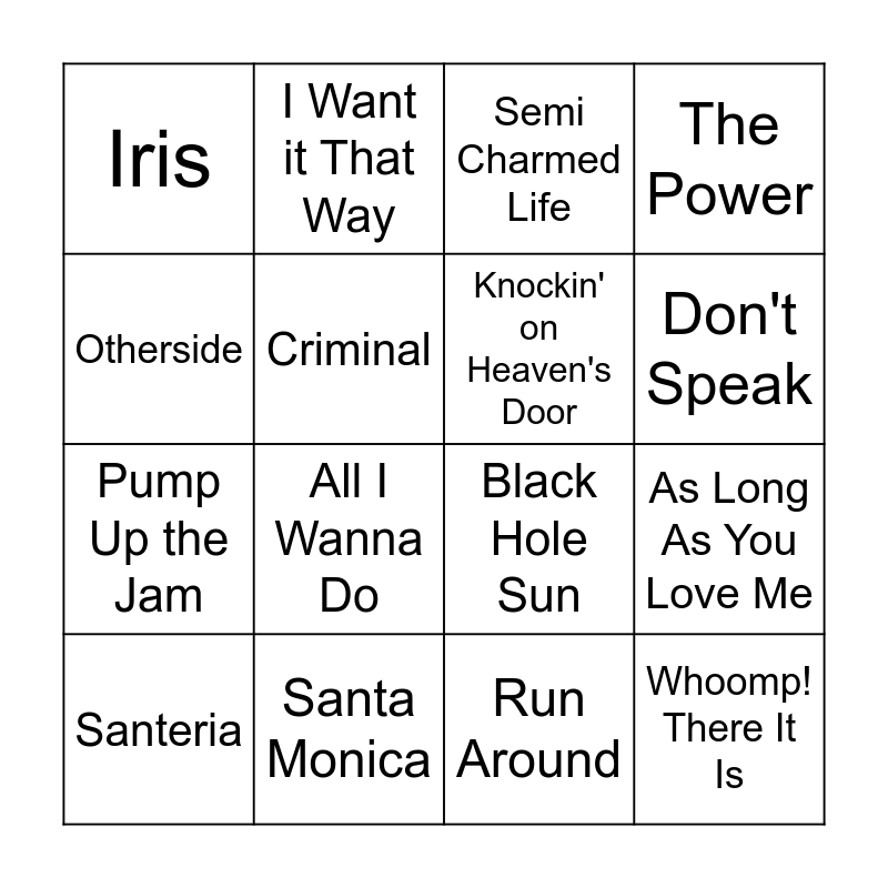 This bingo card has 43 words: Free!, Santeria, Gangsta's Paradise, All The Small Things, Smells Like Teen Spirit, Jump Around, Semi Charmed Life, Counting Blue Cars, Otherside, The Way, The Power, Santa Monica, Wannabee, One Week, Enter Sandman, Every Morning, U Can't Touch This, Black Hole Sun, 3 AM, All I Wanna Do, I Want it That Way, This Is How We Do It, Vogue, Iris, My Name Is, Run Around, Brass Monkey, Ice Ice baby, Intergalactic, Whoomp! There It Is, Baby One More Time, Unbelievable, Hard To Handle, As Long As You Love Me, My Own Worst Enemy, No Rain, Kiss Me, Don't Speak, Criminal, Pump Up the Jam, Personal Jesus, Knockin' on Heaven's Door and Free!.