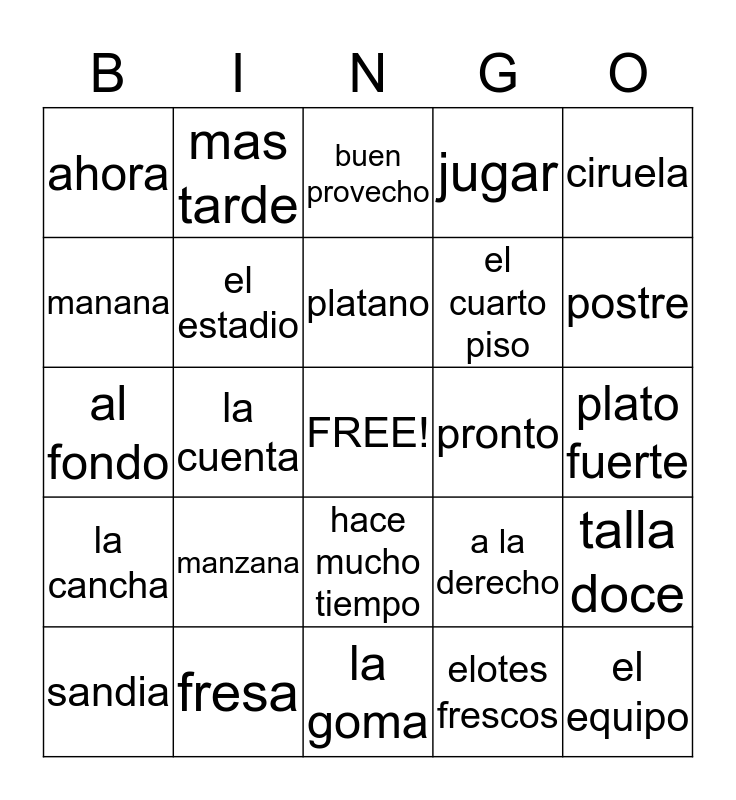 This bingo card has a free space and 24 words: manzana, fresa, platano, sandia, ciruela, ahora, manana, mas tarde, pronto, hace mucho tiempo, el cuarto piso, al fondo, a la derecho, talla doce, el estadio, elotes frescos, plato fuerte, buen provecho, postre, la cuenta, el equipo, la cancha, jugar and la goma.