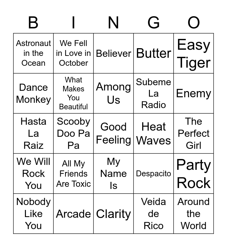 This bingo card has a free space and 24 words: All My Friends Are Toxic, Arcade, Among Us, Nobody Like You, Easy Tiger, Astronaut in the Ocean, Dance Monkey, We Fell in Love in October, Heat Waves, My Name Is, Subeme La Radio, Hasta La Raiz, Despacito, Party Rock, What Makes You Beautiful, Veida de Rico, The Perfect Girl, Believer, Enemy, Scooby Doo Pa Pa, Around the World, We Will Rock You, Butter and Clarity.