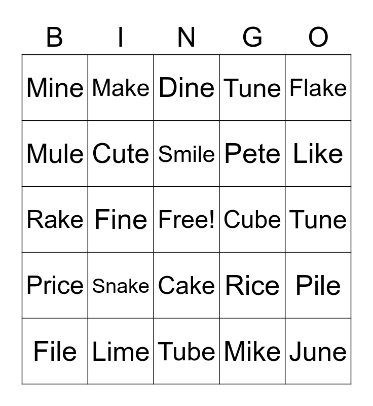 This bingo card has a free space and 30 words: Lime, Dime, Fine, Pine, Mine, Dine, Cute, Cake, Cube, Tube, Tune, June, Mike, Bike, Like, Nice, Rice, Price, Snake, Flake, Rake, Take, Make, Pete, Mule, Tune, Pile, File, Smile and Mile.