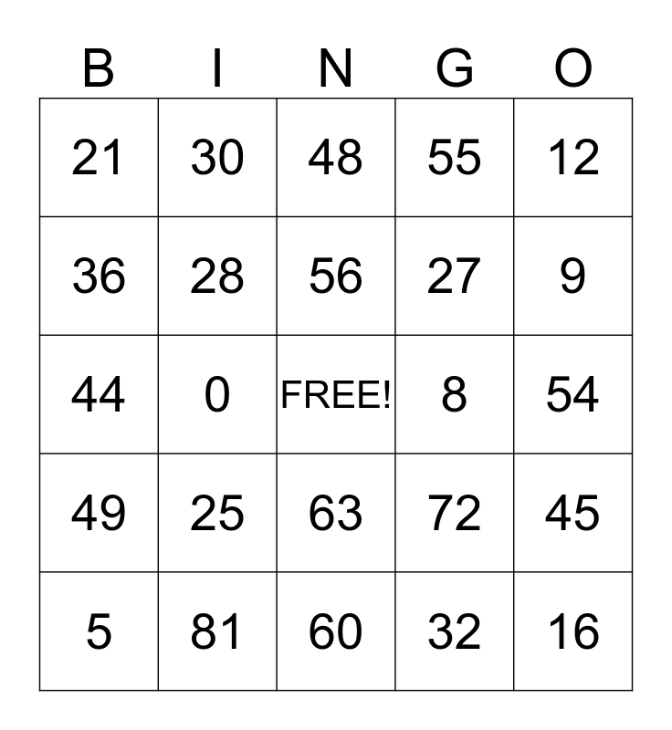 This bingo card has a free space and 24 words: 25, 81, 56, 5, 12, 21, 36, 30, 8, 63, 27, 44, 72, 45, 28, 32, 54, 48, 9, 0, 16, 49, 55 and 60.