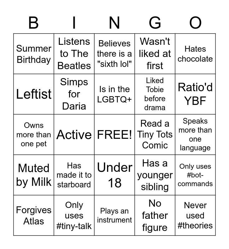 This bingo card has a free space and 24 words: Has made it to starboard, Only uses #tiny-talk, Is in the LGBTQ+, Forgives Atlas, Hates chocolate, Summer Birthday, Leftist, Listens to The Beatles, Read a Tiny Tots Comic, Under 18, Liked Tobie before drama, Owns more than one pet, Has a younger sibling, Only uses #bot-commands, Simps for Daria, No father figure, Speaks more than one language, Believes there is a "sixth lol", Ratio'd YBF, Active, Never used #theories, Muted by Milk, Wasn't liked at first and Plays an instrument.