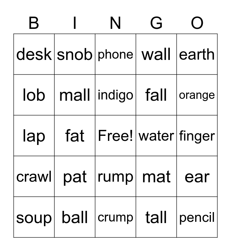 This bingo card has a free space and 58 words: fall, ball, wall, crawl, tall, all, mall, scrawl, fall, ball, wall, dirt, sand, grass, tree, desk, pencil, earth, table, indigo, water, phone, soup, ear, cup, finger, nose, toe, orange, banana, bean, kiwi, bread, gog, cat, rat, bat, fat, lap, sat, pat, tophat, mat, wobble, jump, bump, thump, rump, crump, grump, lump, bob, rob, cob, snob, drob, lob and job.