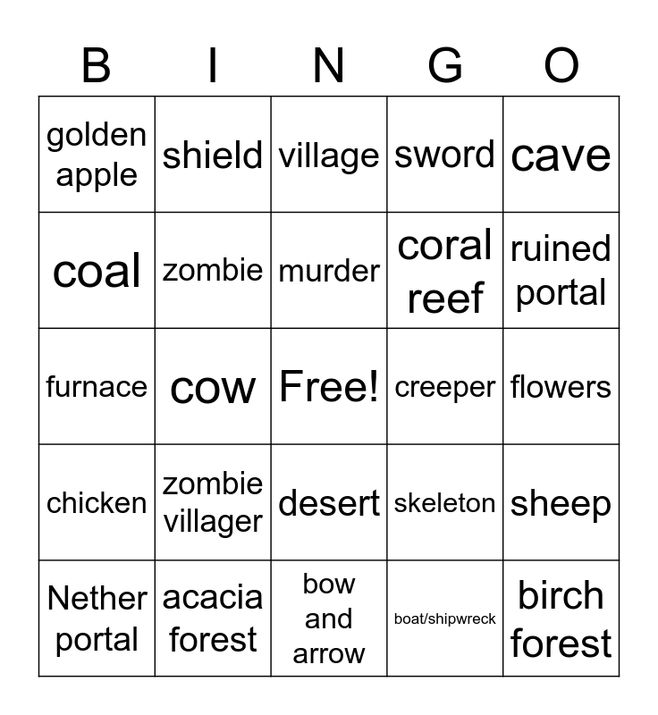 This bingo card has a free space and 29 words: Nether portal, pig, cow, iron pickaxe, golden apple, village, zombie, zombie villager, creeper, acacia forest, flowers, birch forest, bow and arrow, boat/shipwreck, ruined portal, lava, desert, chicken, cave, furnace, skeleton, jungle, coral reef, coal, sword, shield, sheep, murder and death.