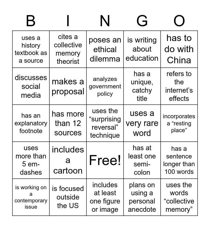 This bingo card has 26 words: Free!, plans on using a personal anecdote, analyzes government policy, is focused outside the US, has to do with China, uses a history textbook as a source, discusses social media, cites a collective memory theorist, incorporates a “resting place”, has at least one semi-colon, has a unique, catchy title, has an explanatory footnote, has a sentence longer than 100 words, is working on a contemporary issue, has more than 12 sources, uses a historical anecdote as a hook, is writing about education, uses more than 5 em-dashes, poses an ethical dilemma, uses the “surprising reversal” technique, refers to the internet’s effects, includes at least one figure or image, uses a very rare word, includes a cartoon, makes a proposal and uses the words “collective memory”.