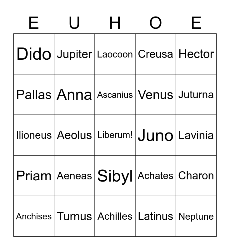 This bingo card has a free space and 24 words: Aeneas, Turnus, Ascanius, Anchises, Hector, Dido, Pallas, Jupiter, Juno, Sibyl, Venus, Ilioneus, Achates, Charon, Anna, Latinus, Lavinia, Laocoon, Juturna, Aeolus, Neptune, Priam, Creusa and Achilles.