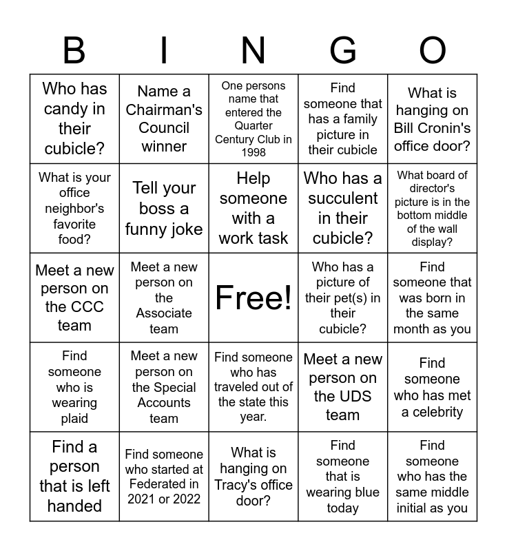 This bingo card has a free space and 24 words: Find a person that is left handed, Meet a new person on the Special Accounts team, Help someone with a work task, Find someone that is wearing blue today, What is hanging on Bill Cronin's office door?, Who has candy in their cubicle?, Name a Chairman's Council winner, One persons name that entered the Quarter Century Club in 1998, Who has a picture of their pet(s) in their cubicle?, Find someone that was born in the same month as you, Meet a new person on the CCC team, Tell your boss a funny joke, Meet a new person on the UDS team, Find someone who has met a celebrity, What is your office neighbor's favorite food?, Find someone who started at Federated in 2021 or 2022, What is hanging on Tracy's office door?, Find someone that has a family picture in their cubicle, What board of director's picture is in the bottom middle of the wall display?, Find someone who is wearing plaid, Meet a new person on the Associate team, Find someone who has traveled out of the state this year., Who has a succulent in their cubicle? and Find someone who has the same middle initial as you.