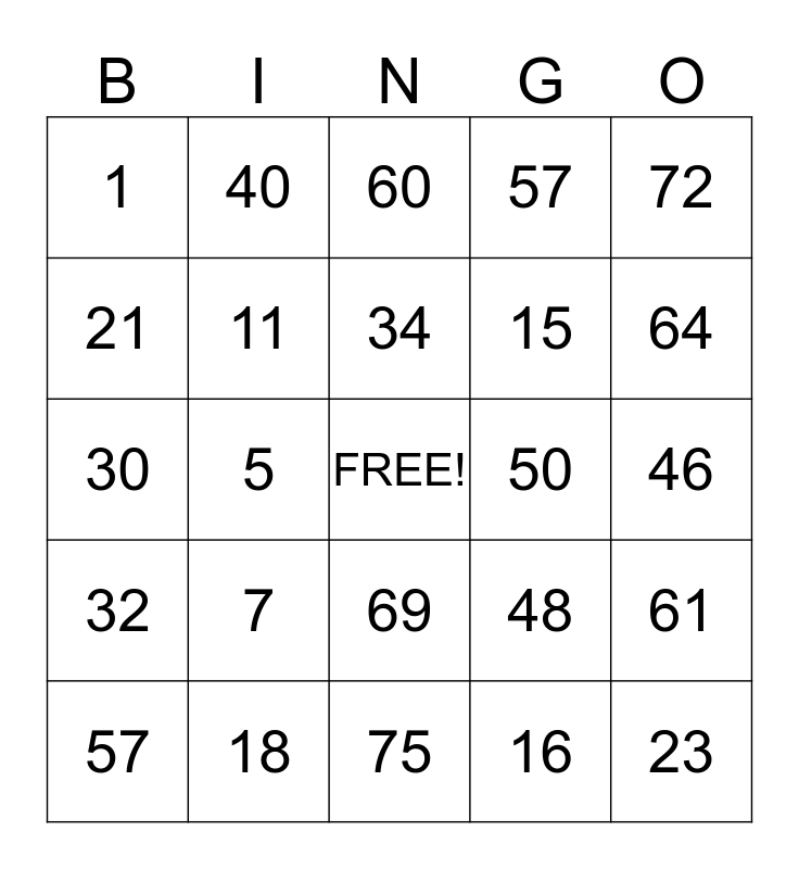 This bingo card has a free space and 24 words: 7, 18, 34, 57, 72, 1, 21, 40, 50, 69, 15, 30, 48, 61, 11, 16, 46, 60, 64, 5, 23, 32, 57 and 75.