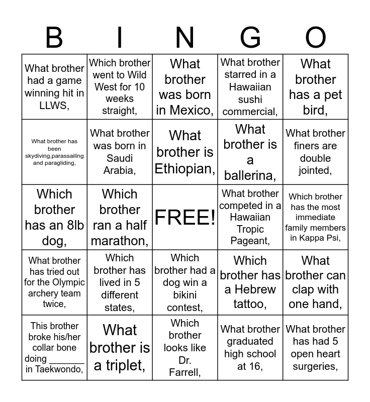 This bingo card has a free space and 59 words: f, What brother is a triplet,, What brother has played ice hockey for 14 years,, What brother has tried out for the Olympic archery team twice,, What brother graduated high school at 16,, What brother knows sign language,, What brother was born in Saudi Arabia,, What brother has extremely short pinkies,, What brother is a ballerina,, What brother has had a cow sit on her,, What brother starred in a Hawaiian sushi commercial,, What brother's entire family has the same middle name,, What brother has been skydiving,parassailing and paragliding,, What brother breaks it down when her jam is on,, What brother has played tennis for 10 years,, What brother had a game winning hit in LLWS,, What brother has had 5 open heart surgeries,, What brother has a pet bird,, What brother is from Alaska,, What brother is Ethiopian,, What brother competed in a Hawaiian Tropic Pageant,, What brother was born in Mexico,, This brother broke his/her collar bone doing _______ in Taekwondo,, What brother can clap with one hand,, Can you guess which brother is really good at hula hooping,, Which brother still has her "blankey",, Which brother is obsessed with guinea pigs,, What brother is on Google Street View,, What brother finers are double jointed,, Which brother is a gamer and loves comic books,, Which brother is a two-time State Powerlifter Champion,, What brother can't swim,, Which brother can program games,, Which brother was awarded the Order of the Silver Mortar,, Which brother went to Wild West for 10 weeks straight,, Which brother ran into a fire hydrant while jogging,, Which brother keeps up with 20 TV shows,, Which brother ran a half marathon,, Which brother can do a handstand for 1 min,, Which brother has an 8lb dog,, Which brother grew up in a town with less than 1500 people,, Which brother has lived in 5 different states,, Which brother has the most immediate family members in Kappa Psi,, Which brother likes to dance,, Which brother has a dog named Peanut Prescott Butter,, Which brother only likes cheesecake for dessert,, Which brother has traveled to Costa Rica,, Which brother can speak Arabic,, Which brother had a dog win a bikini contest,, Which brother looks like Dr. Farrell,, Which brother was born during a cowboys game,, What brother remebers lyrics over brand/generics,, Which brother has a fraternal twin sister,, Which brother favorite show is Naked and Afraid,, Which brother first name is brother doesn't go by his/her first name,, Which brother has a Hebrew tattoo,, Which brother lived in Las Vegas,, Which brother is from Laredo and has three brothers, and Which brother last name is dweller by the apple tree,.