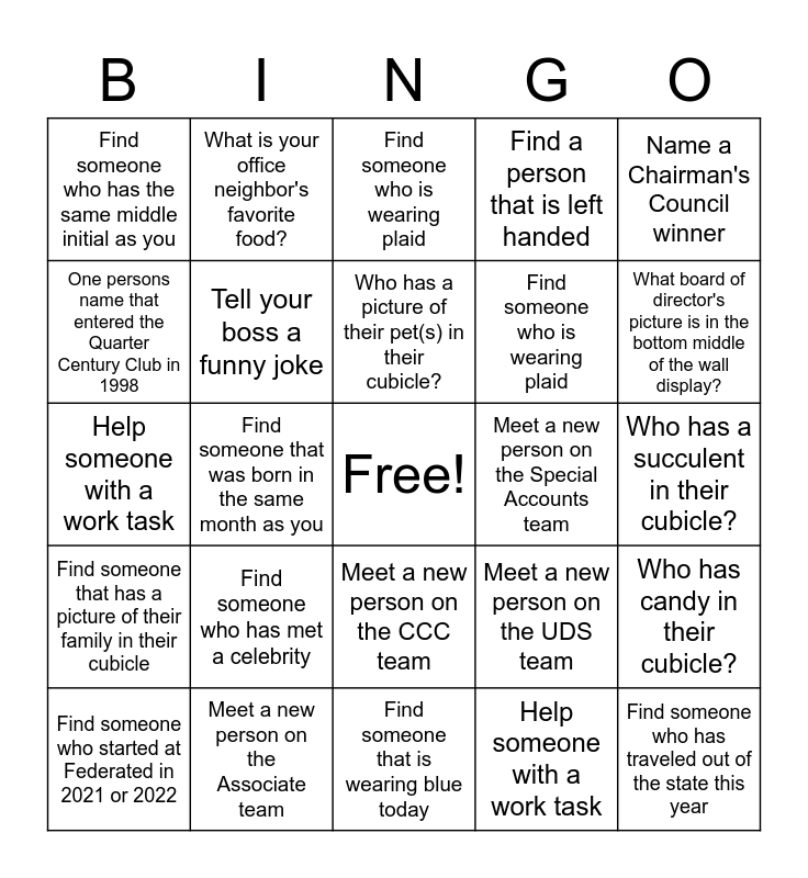 This bingo card has a free space and 24 words: Find someone who started at Federated in 2021 or 2022, Find someone who has met a celebrity, Who has a picture of their pet(s) in their cubicle?, Help someone with a work task, Name a Chairman's Council winner, Find someone who has the same middle initial as you, What is your office neighbor's favorite food?, Find someone who is wearing plaid, Meet a new person on the Special Accounts team, Who has a succulent in their cubicle?, Help someone with a work task, Tell your boss a funny joke, Meet a new person on the UDS team, Who has candy in their cubicle?, One persons name that entered the Quarter Century Club in 1998, Meet a new person on the Associate team, Find someone that is wearing blue today, Find a person that is left handed, What board of director's picture is in the bottom middle of the wall display?, Find someone that has a picture of their family in their cubicle, Find someone that was born in the same month as you, Meet a new person on the CCC team, Find someone who is wearing plaid and Find someone who has traveled out of the state this year.