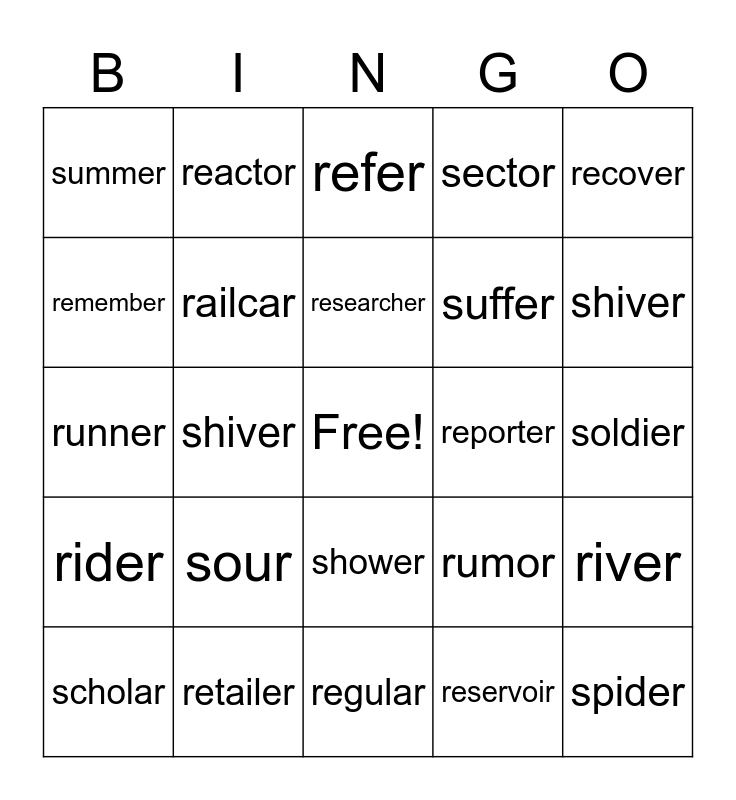 This bingo card has a free space and 27 words: register, retailer, researcher, reservoir, recover, remember, reactor, regular, reporter, river, rider, railcar, rumor, spider, runner, reader, refer, sector, soldier, summer, sour, shower, suffer, shiver, scholar, shiver and sweater.