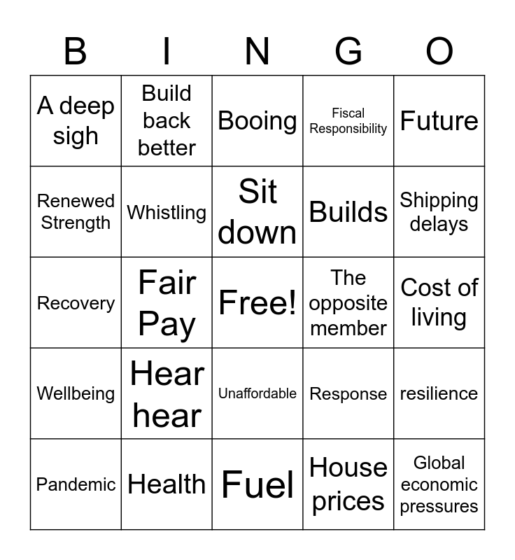 This bingo card has a free space and 29 words: Pandemic, A glimpse of a Floral Tie, Fair Pay, Climate Change, A deep sigh, Booing, Whistling, Hear hear, The opposite member, Health, Cost of living, Global economic pressures, Fuel, House prices, Shipping delays, Interest rates, Unaffordable, Wellbeing, Future, Recovery, Response, Head wind, Builds, Renewed Strength, Fiscal Responsibility, Build back better, resilience, Sit down and Irresponsible.